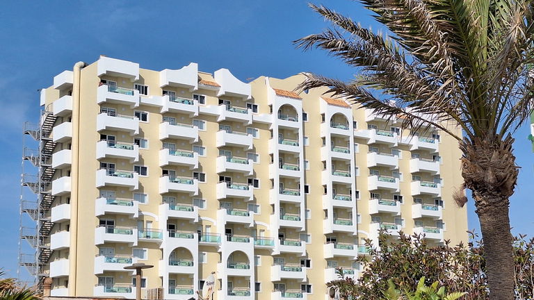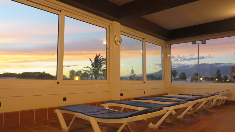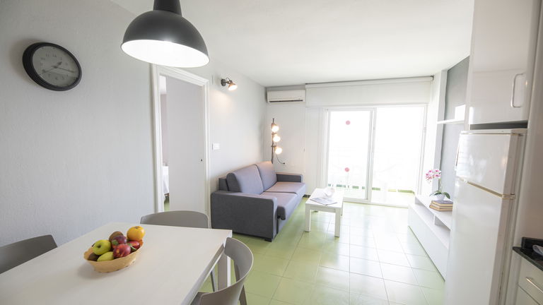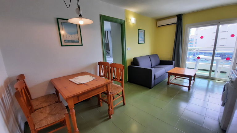 El Apartamento Superior destinos de sol, está distribuido en salón cocina, habitación y baño. La capacidad es para dos adultos en habitación y otro adulto o 2 niños en el sofá cama. Todos los apartamentos tienen vistas al mar y cuenta con salida al balcón desde el salón, para que disfrute de un ambiente tranquilo y relajante. Dispone de dos camas de 1.05 con armario ropero empotrado, cocina totalmente equipada (electrodomésticos, vajilla y menaje) y baño completo. Además espacios comunes, piscina exterior, piscina interior climatizada con solarium, zona de relax y sport, sala de lectura, cafetería y buffet.